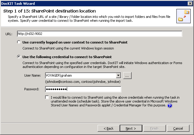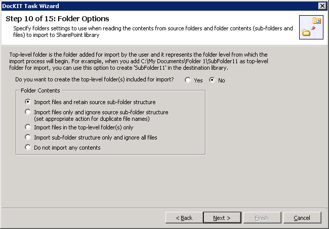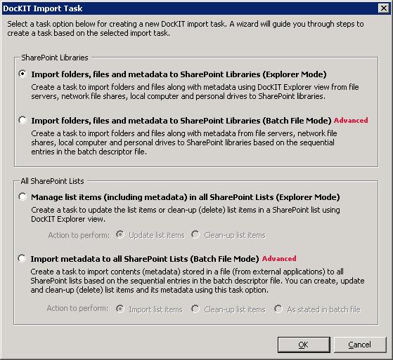 - In DocKIT, create an import task using Import folders, files and metadata to SharePoint Libraries (Explorer Mode) or Import folders, files and metadata to SharePoint Libraries (Batch File Mode) option.