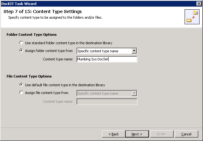 - In this step, under Folder Content Type Options, specify a content type that is derived from ‘Document Set’ content type. You can either enter a content type name or select a column in the external metadata file (that contains the content type name) to be used.