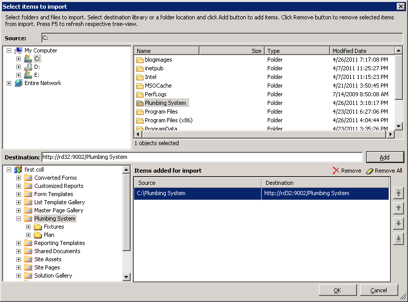 In Select items to import dialog, add the desired folders that you want to create as document sets in the destination SharePoint libraries.