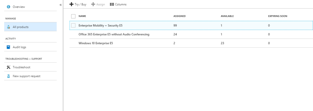 Once you open your Azure Portal, navigate to “Licenses” section present in Azure Active Directory. The list of products, currently available for Organization, will be displayed in the Licenses page.