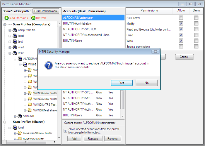 - You can use many options like Add the new permissions to the account’s existing permissions, Replace the account’s existing permissions with the new permissions, etc. You may select options to Allow, Block inheritance from the parent object and also Replace all child objects’ existing permissions with the inheritable permissions from this object while copying permissions to target shares.