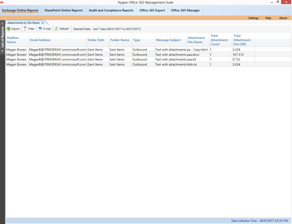 This report displays the total number of mail items based on attachments – Attachment mail by Subject, Attachment mail by File Name, Attachment mail by File Type and Attachment mail by File Size.