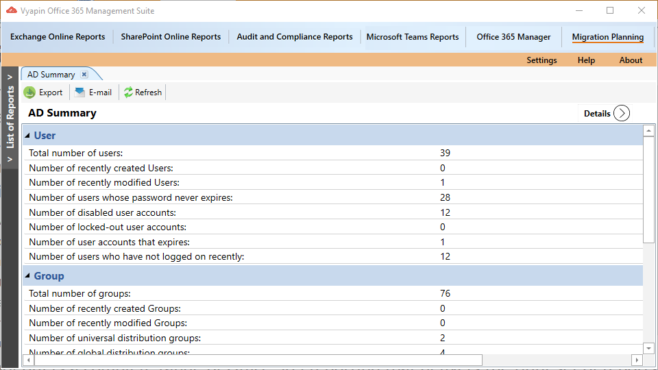 Analyzing Active Directory helps you to find total number of users, groups, organizational units, containers, contacts and computers available under the specific Active Directory. Active Directory Analyzer helps you to find objects that are not required to migrate such as groups with no members or owners, inactive users in active directory etc.