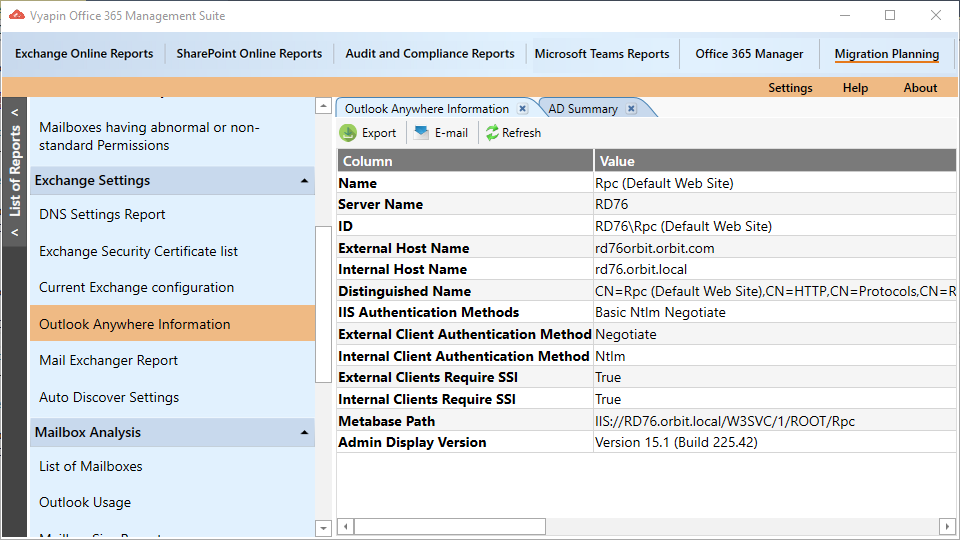 Exchange Server Settings provides detailed information about settings that are configured in the given On-Premises Exchange Server. This includes DNS Settings, Certificates, Outlook Anywhere configuration, Mail Exchanger and auto Discover Settings. This feature assists system administrators to gather and understand all the technical details required before moving to Office 365.
